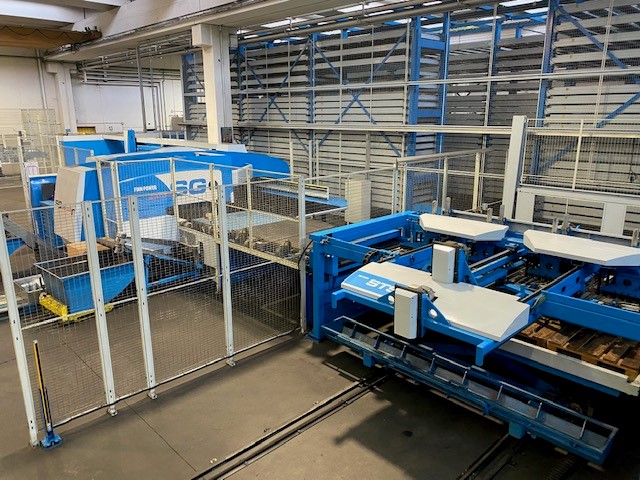 L’impianto è dotato di carico e scarico automatici , collegati tramite apposite stazioni di connessione al magazzino automatico , il quale esegue autonomamente le operazioni di carico della materia prima necessaria per lo specifico