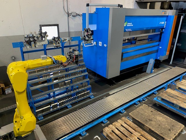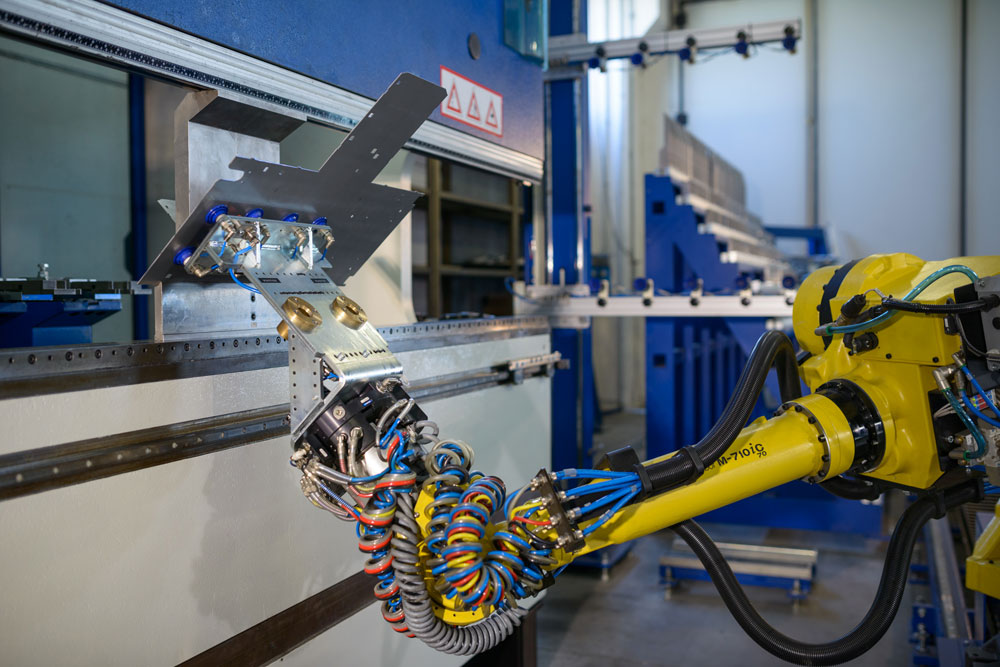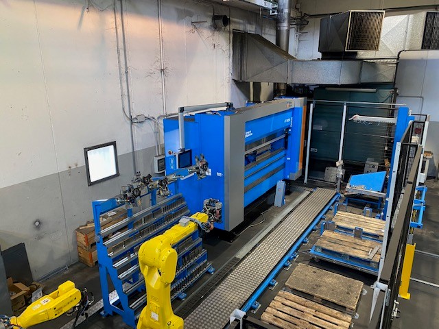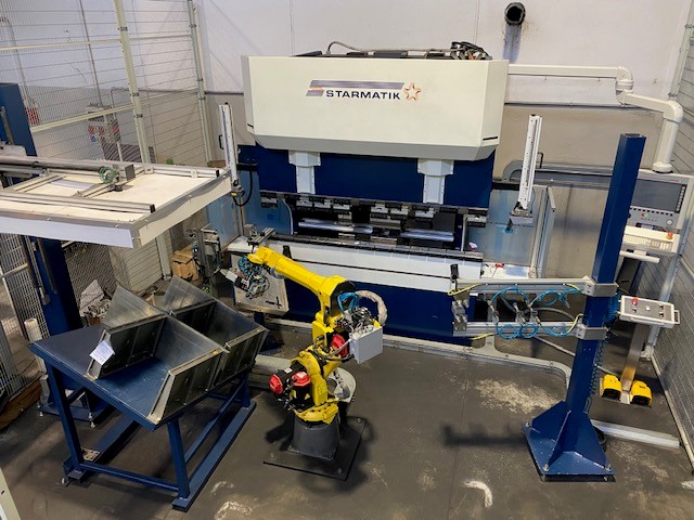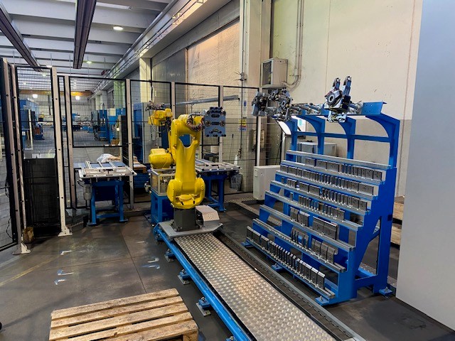 La cella più piccola lavora su piegatrice Warcom da 2 mt e 50 ton di portata, ed è asservita da Robot Fanuc fisso con portata al braccio di 10 Kg. Ideale per pezzi di piccole dimensioni, dispone anche di un sistema di visione per la minuteria.